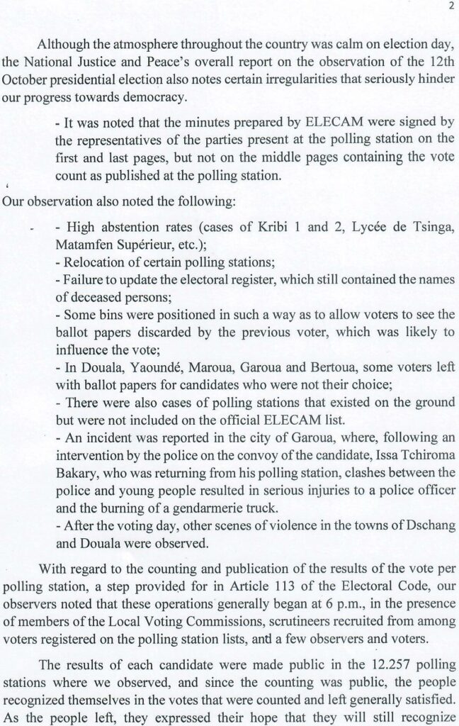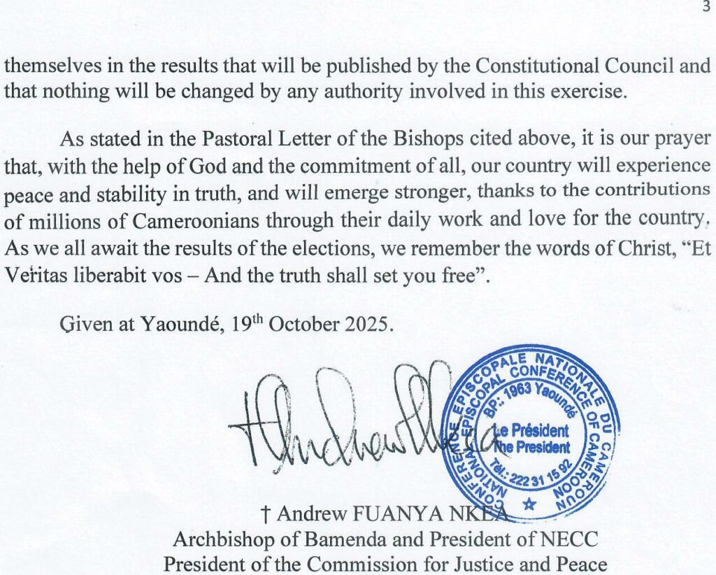 Statement of the National Episcopal Conference of Cameroon on the Presidential Election Of 12 October 2025