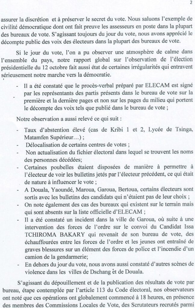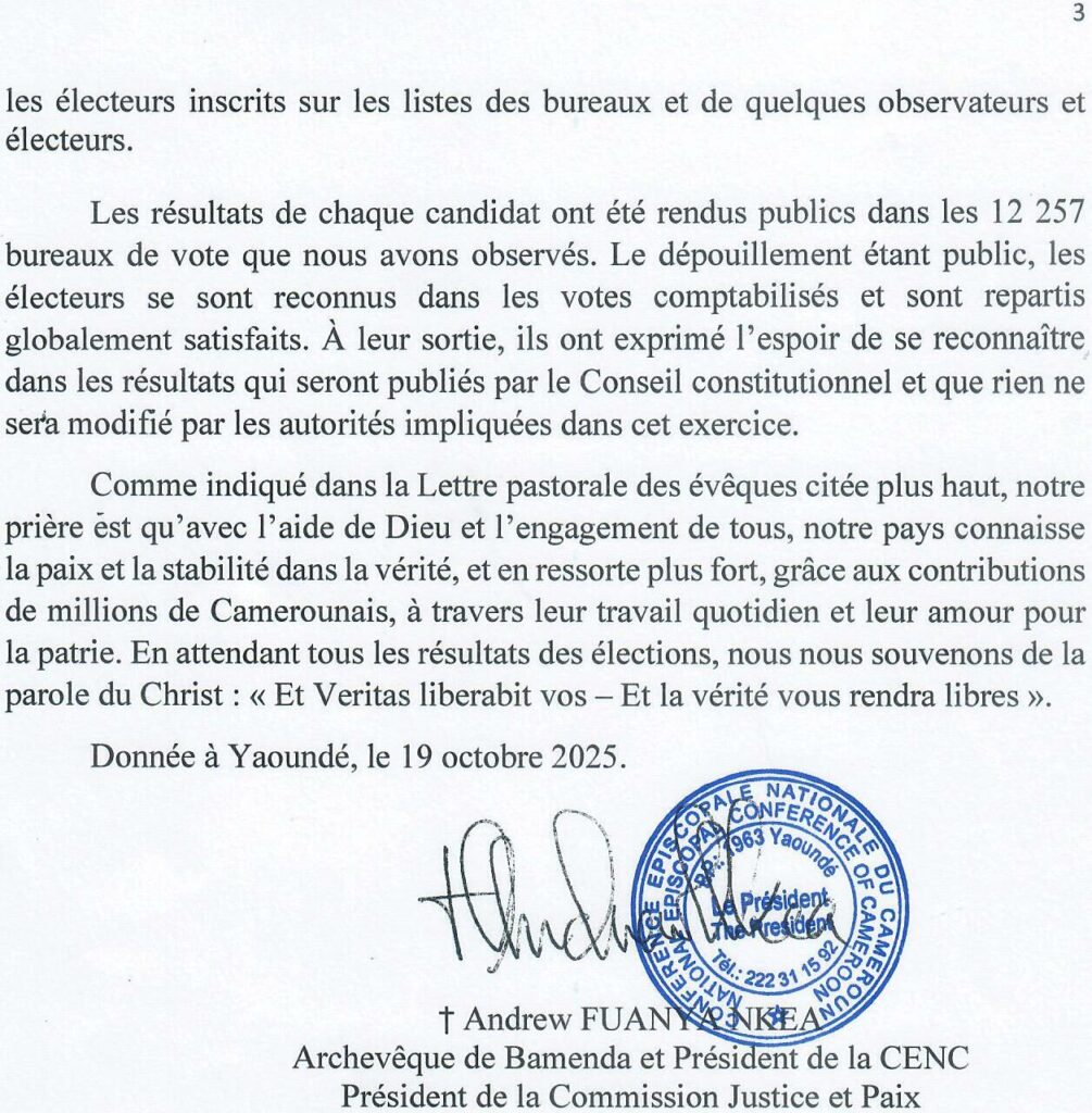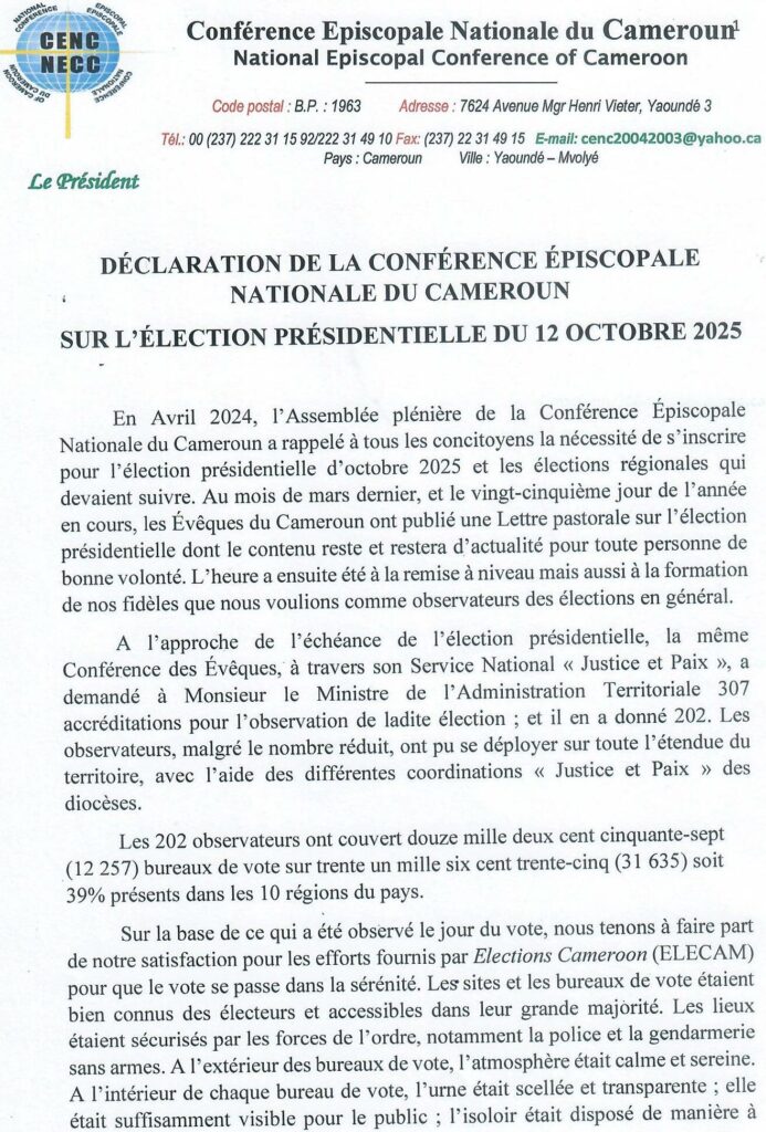 Les Évêques catholiques du Cameroun saluent le déroulement paisible et ordonné de l’élection présidentielle du 12 octobre, tout en exprimant leurs inquiétudes face à des irrégularités susceptibles de fragiliser la confiance électorale. Ils appellent à la vérité, à la vigilance et au calme. Lisez le communiqué intégral publié le 19 octobre 2025.