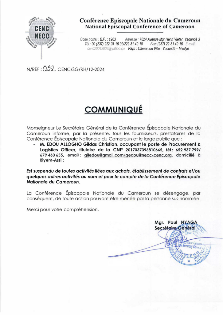 M. EDOU ALLOGHO Gildas Christian, est suspendu de toutes activités liées aux achats, établissement de contrats et/ou quelques autres activités au nom et pour le compte de la Conférence Épiscopale Nationale du Cameroun, CENC.